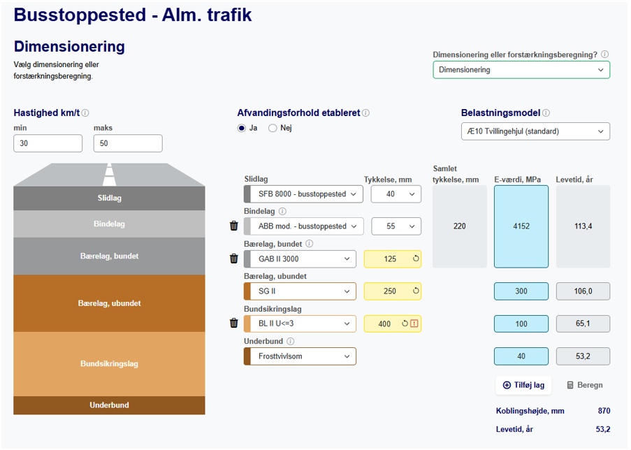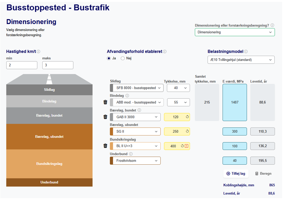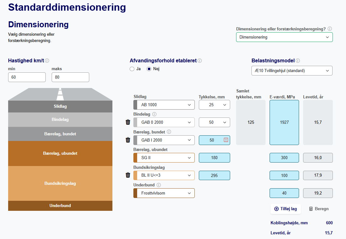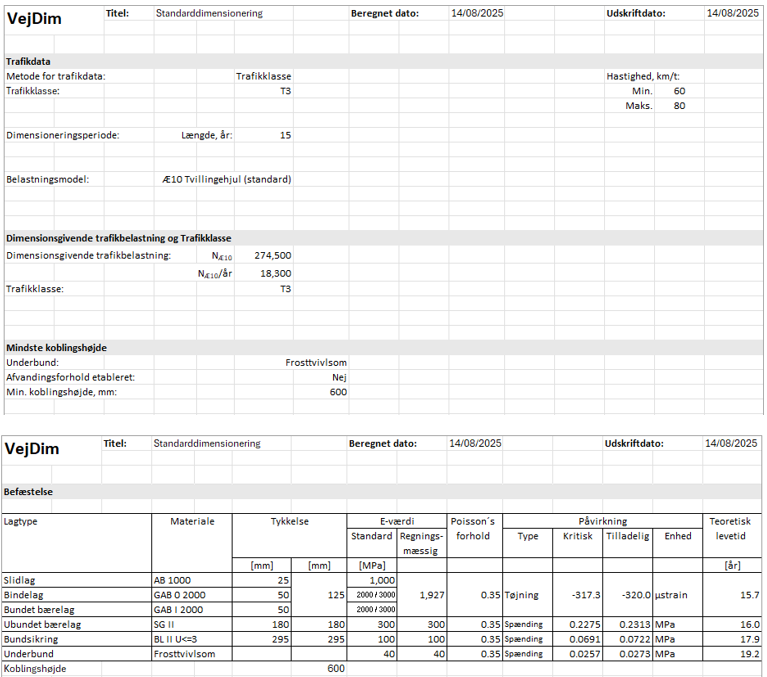 VejDim sikrer at alle lag har en levetid højere end dimensioneringsperioden på 15 år, og at koblingshøjden overholder kravet på 600 mm for Trafikklasse T3 og frosttvivlsom underbund.