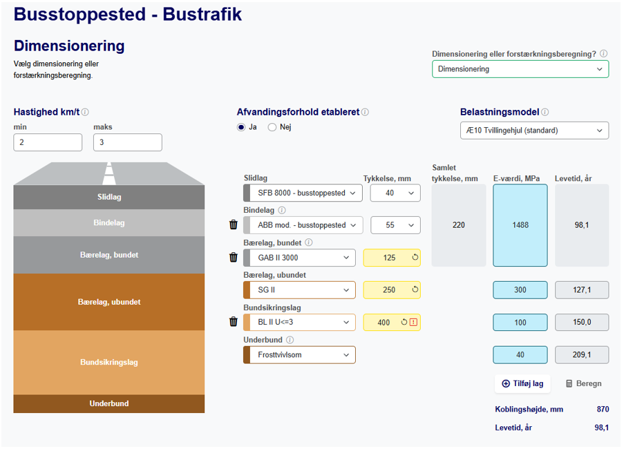 Ved indtastning i VejDim og tryk på ”Beregn” opnås dimensionering som i skærmbilledet herunder.
