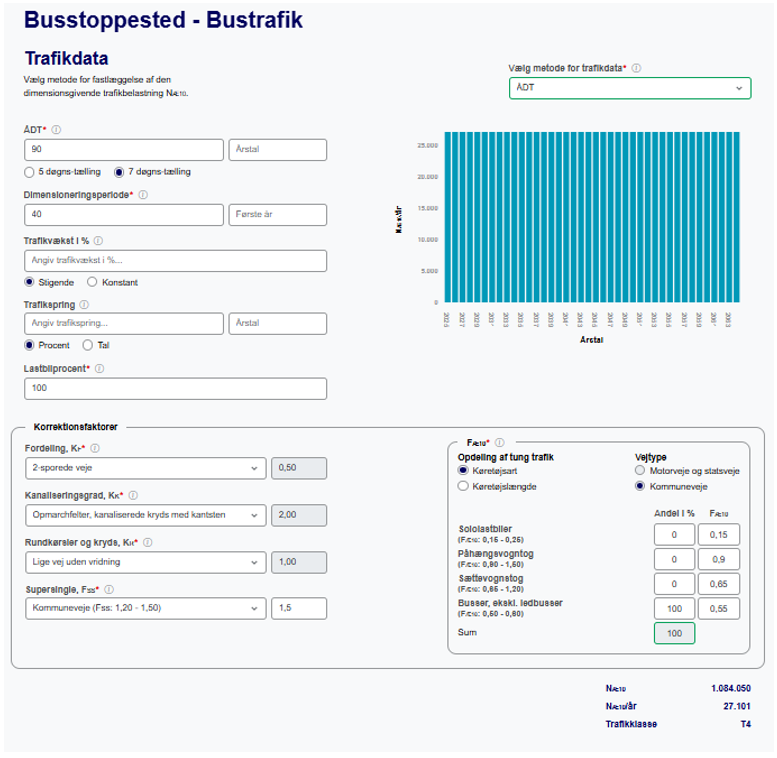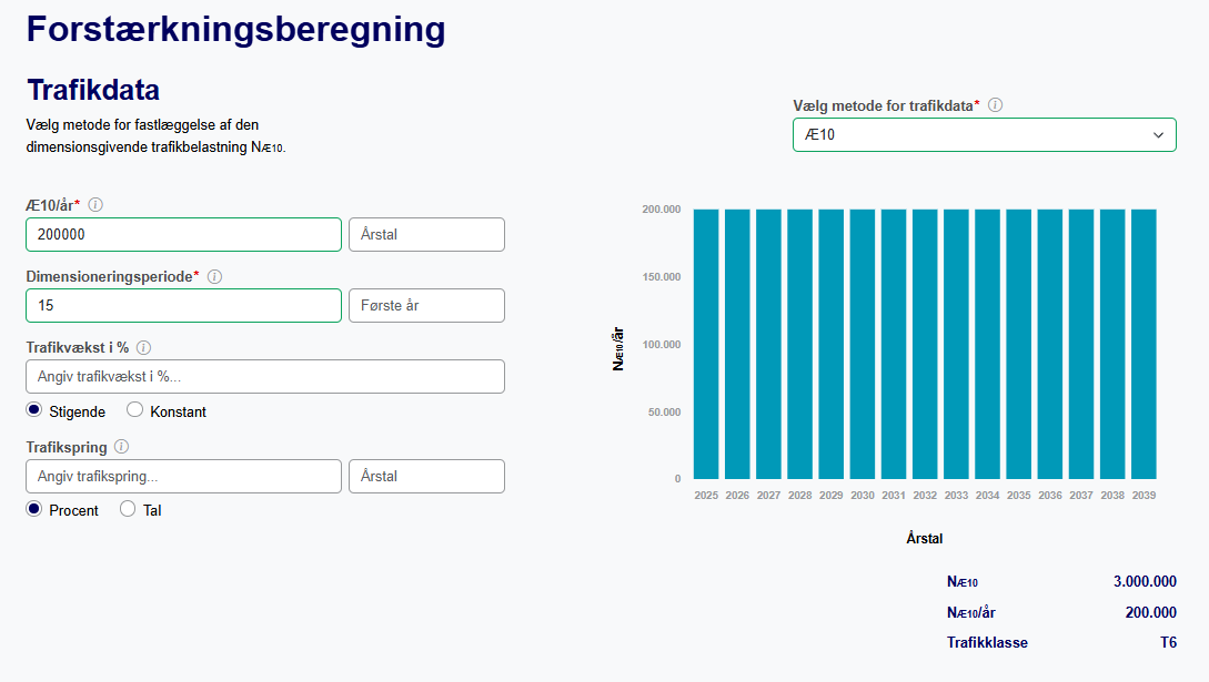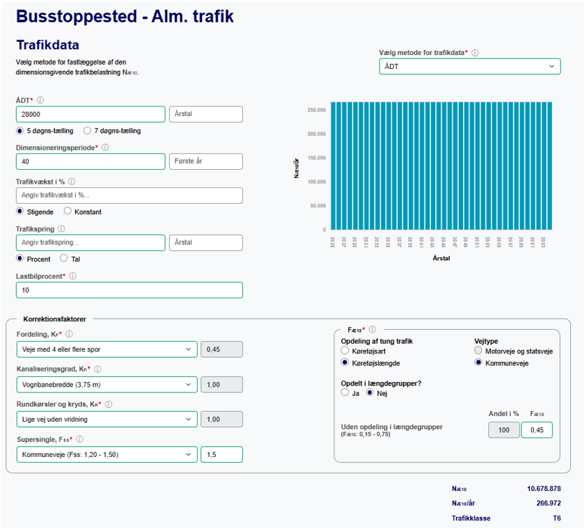 Nederst i hver kolonne er den dimensionsgivende trafikbelastning NÆ10/år skrevet ind. Input og beregningsresultat er vist i skærmbillederne nedenfor.