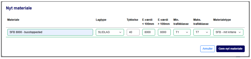 Trin 2: | I dette eksempel ønskes et slidlag af semi-fleksibel belægning (SFB) på busstoppestedet. Dette er ikke et standardmateriale, og derfor skal der oprettes nyt materiale. |