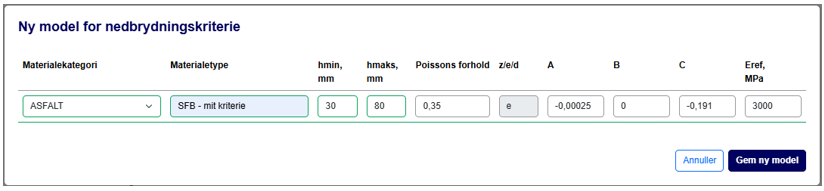 40 mm SFB med 8000 MPa, der kan bruges i trafikklasse T1 til T7. Det vælges også at lave et nyt nedbrydningskriterie, da det ser pænere ud at have et SFB-kriterie til et SFB-lag. Asfaltkriterierne er ens, så man kunne have brugt ethvert andet asfaltkriterie, der omkranser den ønskede lagtykkelse på 40 mm.