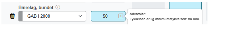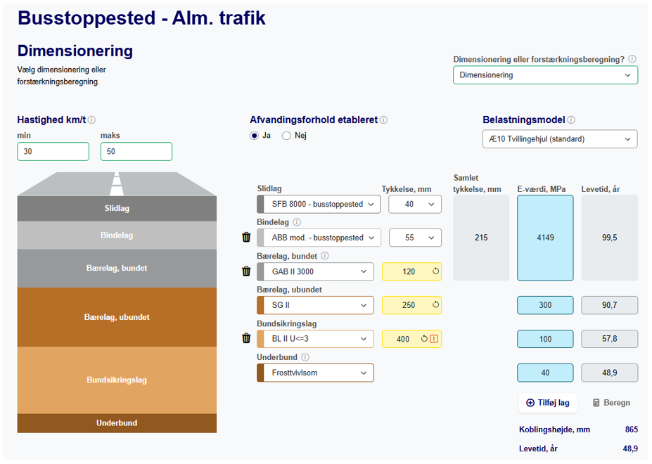Bemærk advarselsfirkanten ved lagtykkelsen af det bundne bærelag, der antyder at lagtykkelsen dimensioneringsmæssigt kunne være mindre, men begrænses af mindste udlægningstykkelse på 50 mm. Dette er årsagen til at VejDim ikke har ramt levetiden mere præcist på 15 år, men er endt på en lidt højere levetid.