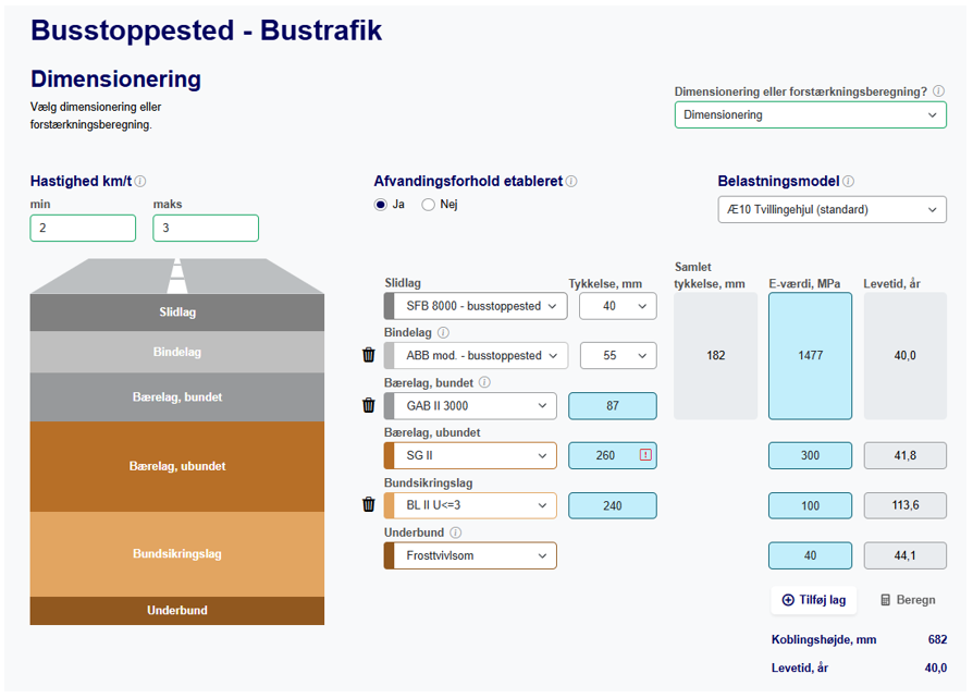 Vejreglernes E-værdier er indsat for materialerne. E-værdien for det samlede asfaltlag er en kombination af E-værdien af slidlag, bindelag og bundet bærelag, vægtet ift. lagtykkelserne.
