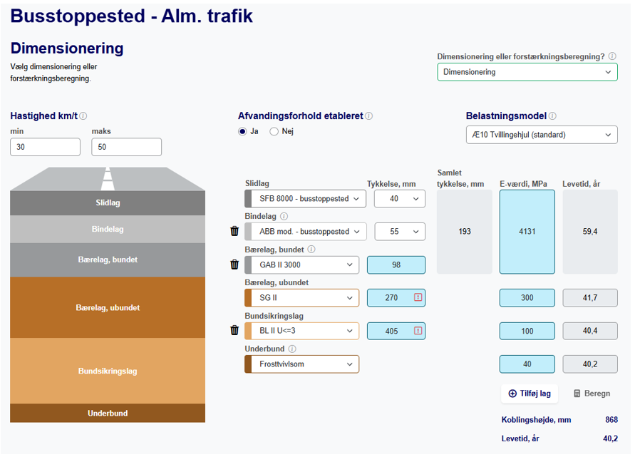 Beregningerne viser, at den samlede bæreevne af den valgte befæstelse ikke er tilstrækkelig til at opnå 40 års levetid, idet det samlede levetidsforbrug overstiger 100 % i ét eller flere lag. Dette justeres i Trin 5 ved at øge tykkelsen af asfaltbærelaget.