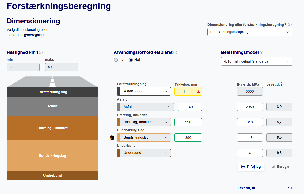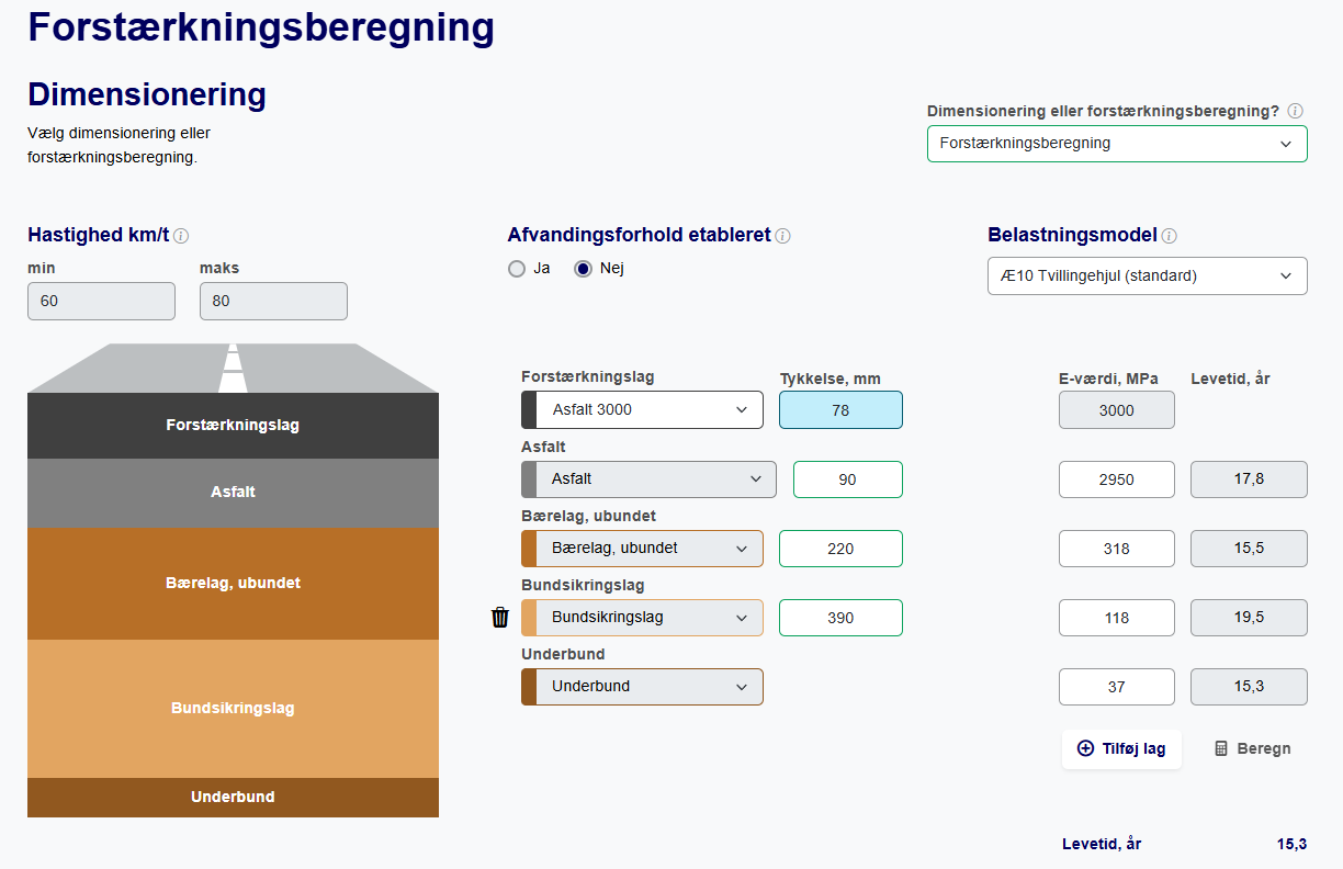 Input til forstærkningsberegningen er sammenhørende lagtykkelser og E-værdier af de enkelte lag i vejbefæstelsen.