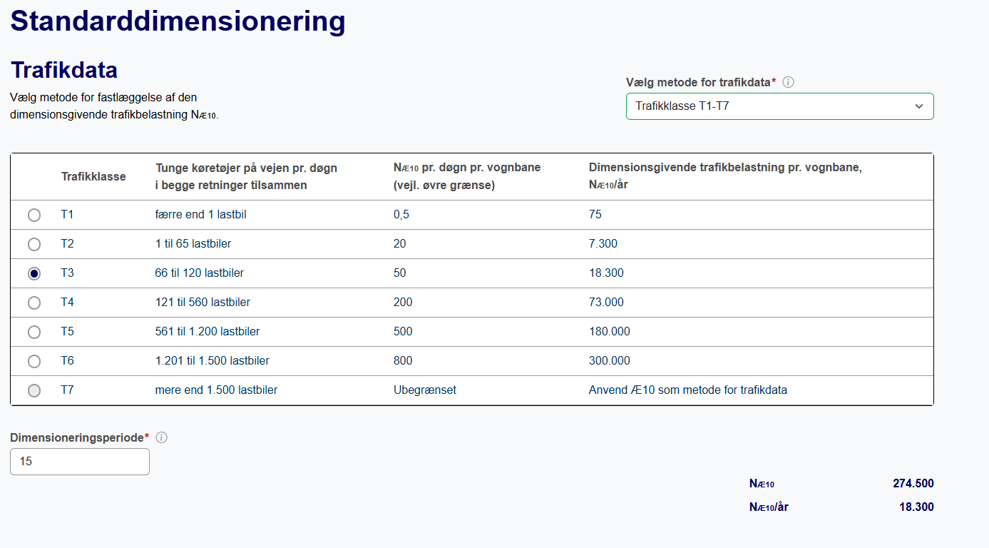 Bruger vælger at bruge Trafikklasse-metoden til at beregne trafikbelastningen. Brug af Trafikklasse T3 er lidt på den sikre side, da den går op til 120 lastbiler i døgnet.