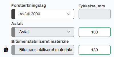 BSM | Bitumenstabiliseret materiale (BSM) kan vælges ved ”Tilføj lag”, “Bitumenstabiliseret materiale”. | ![]() |