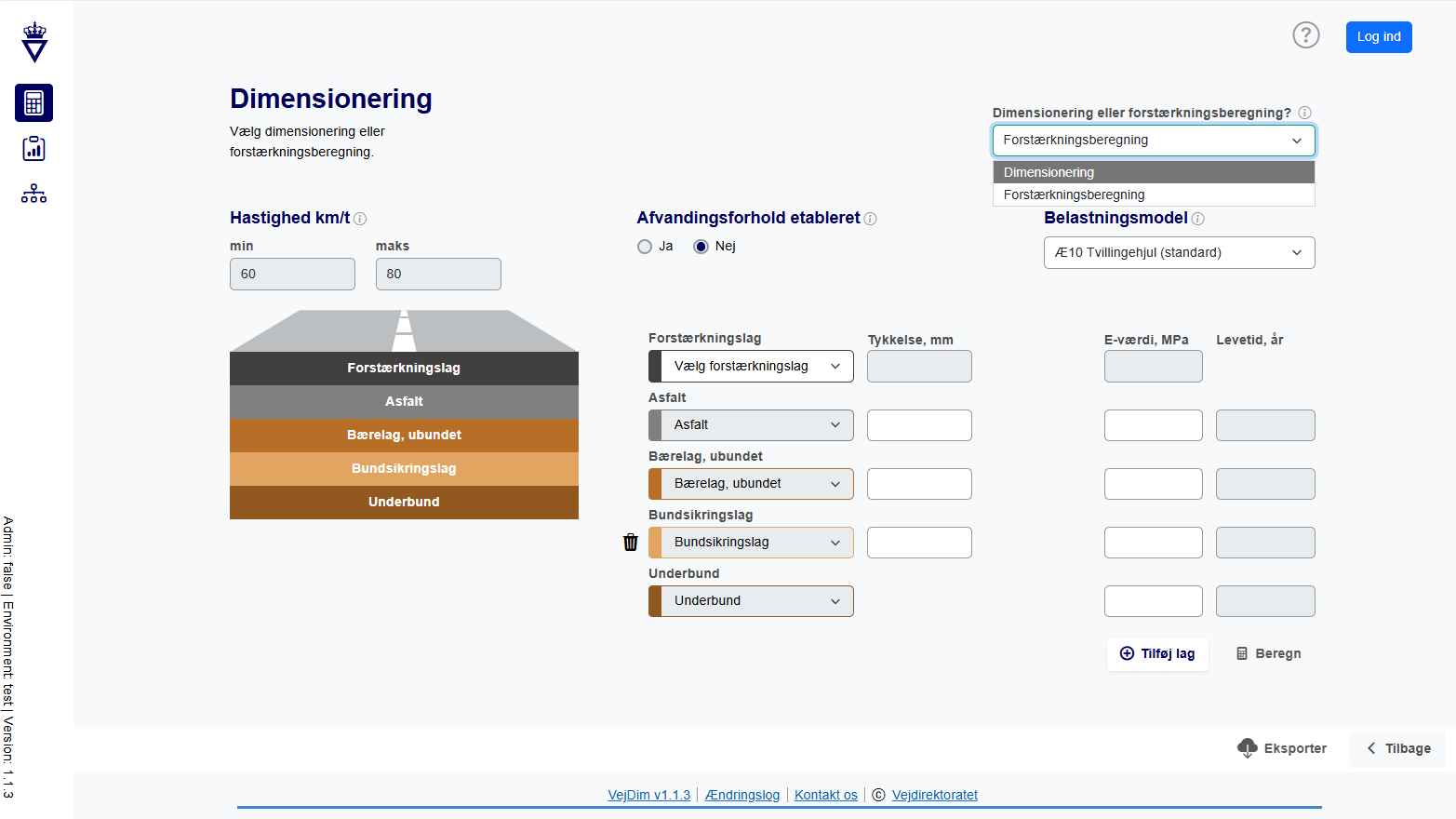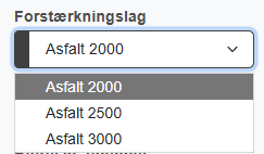 Forstærkningslag | Bruger skal ved dropdown angive forstærkningslaget, i forhold til hvilken E-værdi det antages at have. | ![]() | |