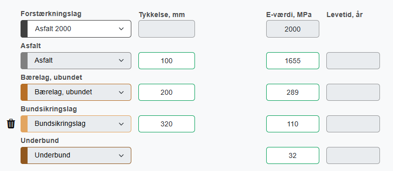 Eksisterende opbygning (grå lag) | Kendte (målte) værdier af lagtykkelse og E-værdier indtastes. Se vejledning til fastsættelse af værdier i eksemplet ”Forstærkningsberegning” | ![]() | |